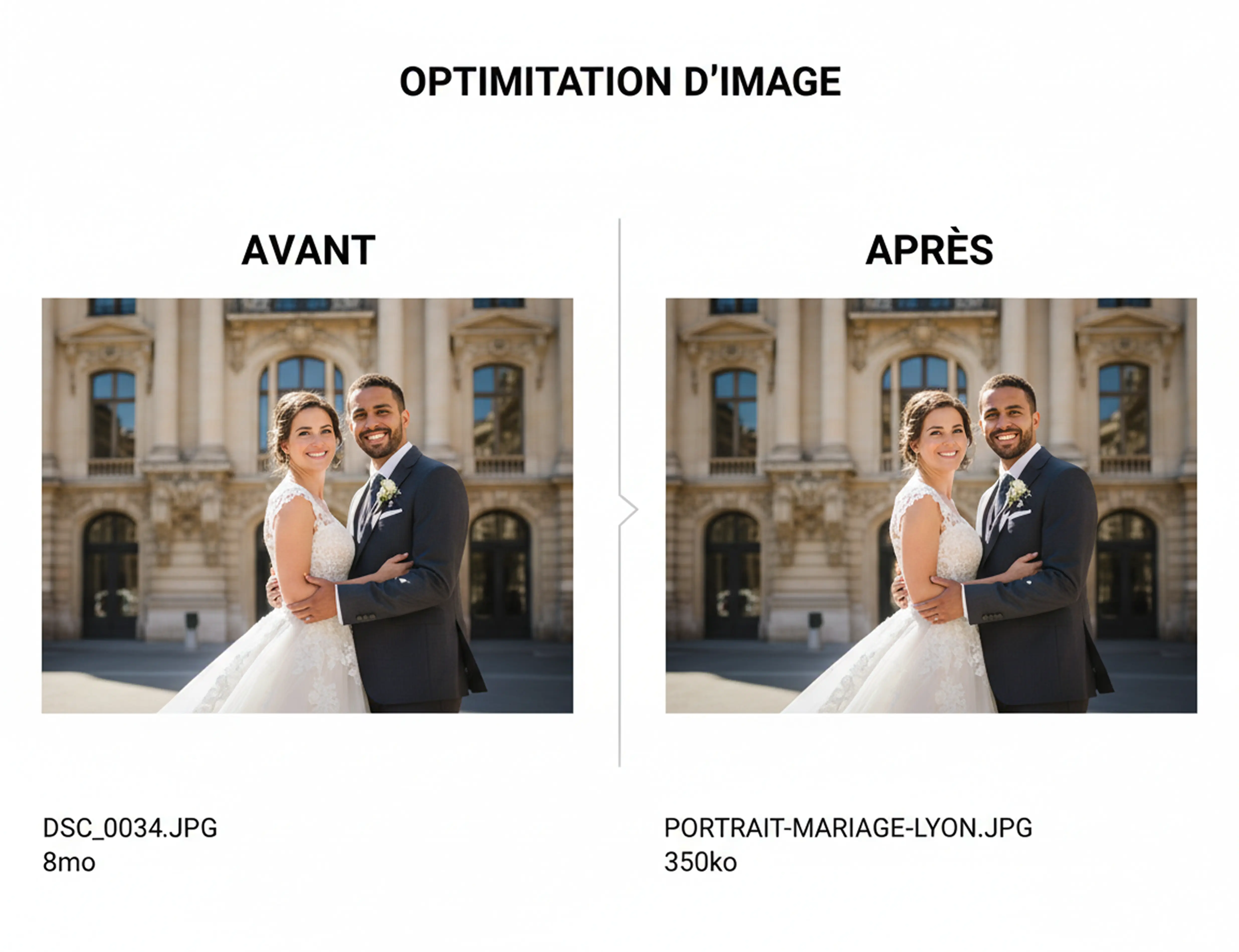 Les textes alternatifs des images (balises alt). Tes photos ne sont pas que de la décoration. Chaque image a une balise alt que Google lit pour comprendre ce qu'elle montre. "Portrait mariage en lumière dorée dans le parc de la Tête d'Or à Lyon" vaut infiniment mieux qu'un alt vide ou un "IMG_4523.jpg".