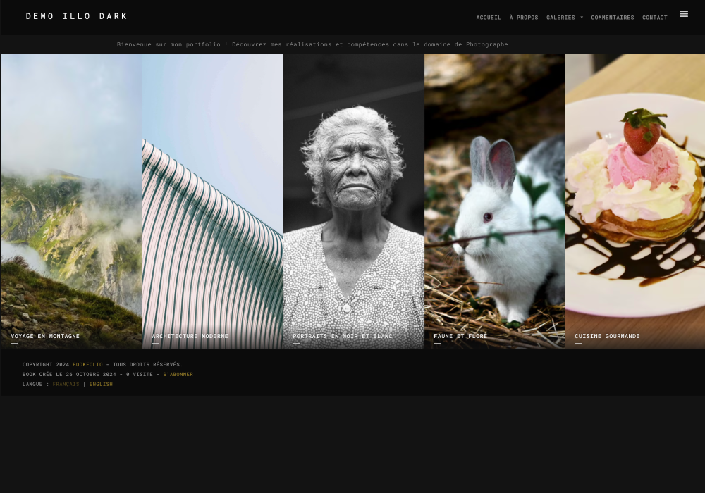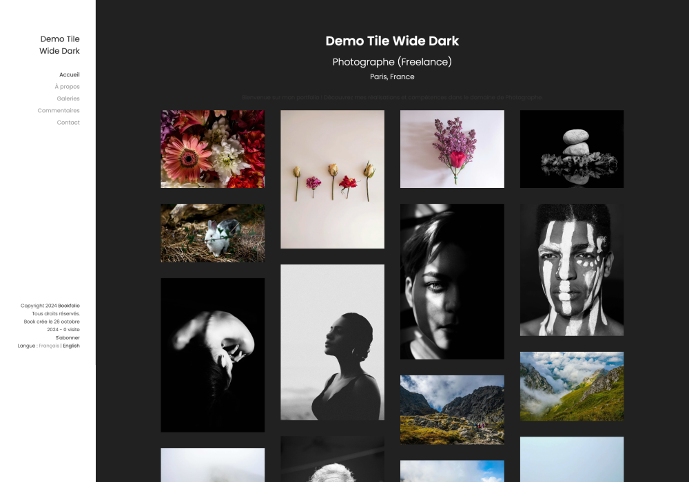 Minimalist portfolio with black background and asymmetric full-width grid to enhance your creations.