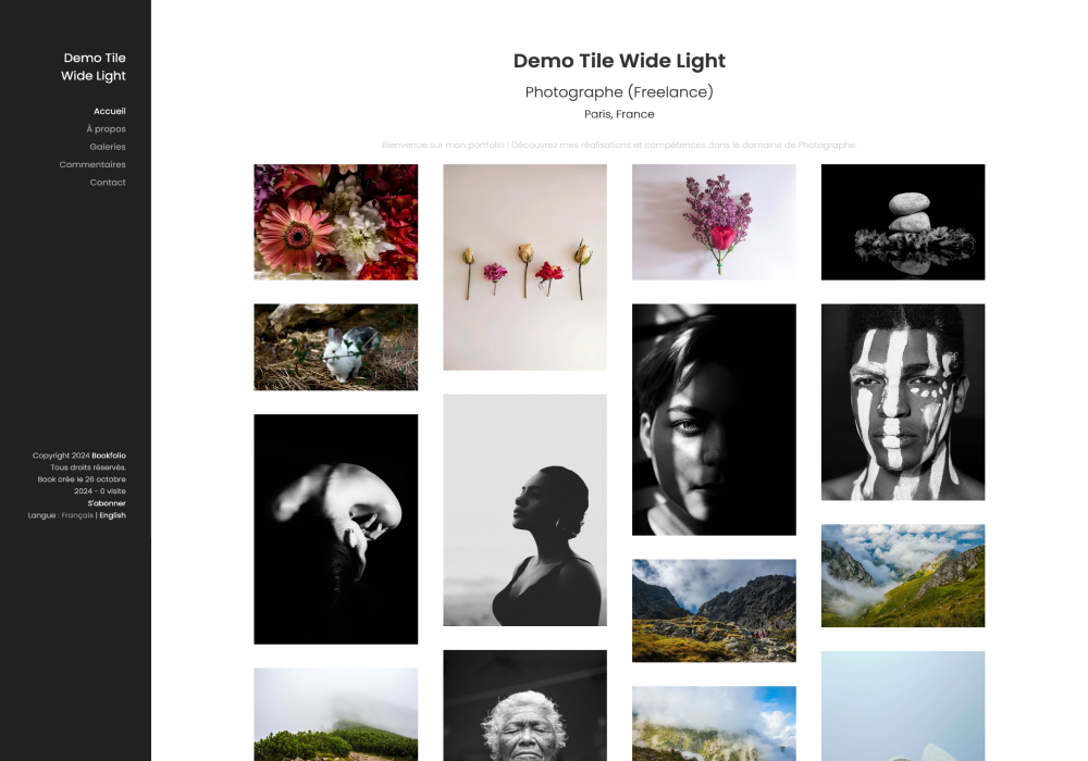 Minimalist black and white portfolio with flexible galleries and clean navigation.