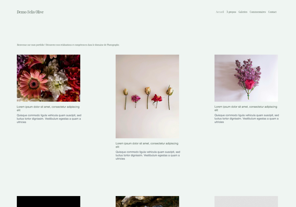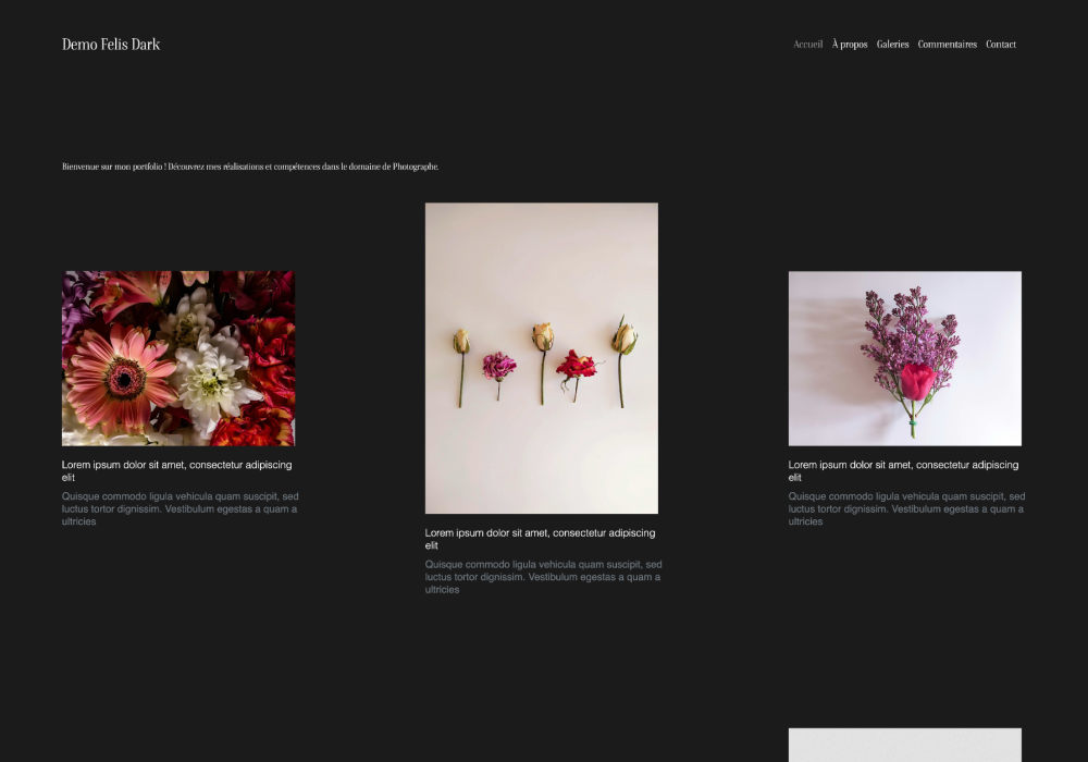 Portfolio minimaliste avec fond noir et grille asymétrique pleine largeur pour sublimer vos créations.
